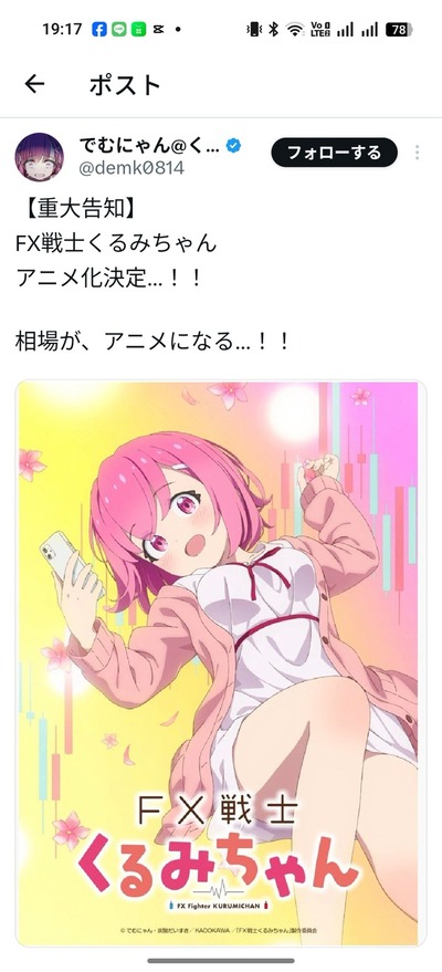 でむにゃんは「私の負のエネルギーから生まれたFXのお話ですが、一体どんなアニメになるのでしょうか…?」と語る。炭酸だいすきはスタッフの熱意を伝えつつ、「アニメならではの新しい魅力が詰まった作品になると確信しています」とコメント。鈴木は意気込みを「手に汗握るどころではない、リアルすぎるFXの世界をお届けするべく精一杯努めさせて頂きます!」と述べた。